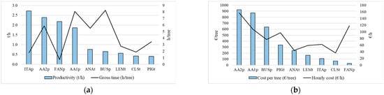 (a) Unitary time (h tree−1) and productivity (Mg h−1) of the nine felling work yards; (b) cost per tree (€ tree−1) and hourly cost (€ h−1) (the subscript “p” means aerial platforms, the subscript “t” means tree-climbing).