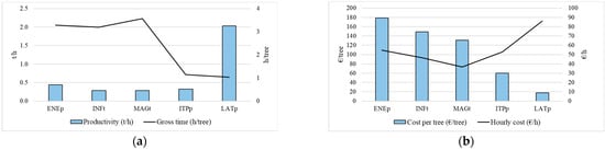 (a) Unitary time (h tree−1) and productivity (Mg h−1) of the five pruning work yards; (b) cost per tree (€ tree−1) and hourly cost (€ h−1) (the subscript “p” means aerial platforms, the subscript “t” means tree-climbing).