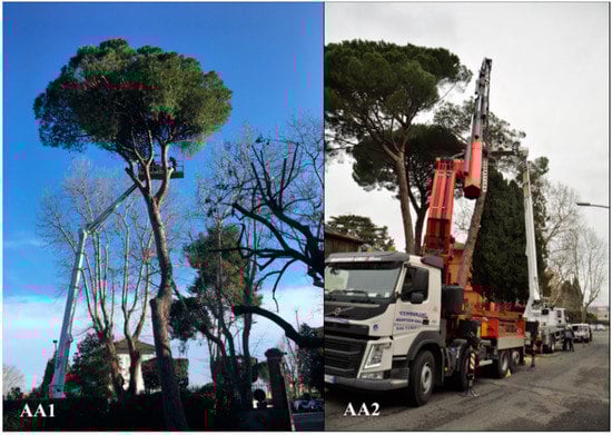 With its distinguishing crown shape, Stone Pine contributes to make unique and pictorial the skyline of the city but it was been widely planted especially between the 20s and 50s of the last century [], so that a great number of trees are now old or senescent. Various other issues bother this species in town, like the threats deriving from climate change (which undermine the static stability of plants), from new pests and pathogens, from mismanagement (especially road maintenance and management of underground facilities) []. Moreover, also pinewoods represent environmental amenity areas at risk, being under siege from intensive urbanization []. In this framework the care of pines is very urgent and complex, and a professional approach is needed to manage and maintain trees in towns as well as to protect workers and residents during all phases of these work sites.