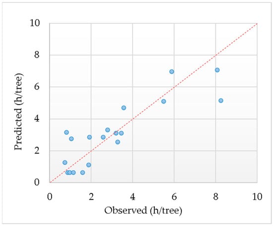 Predicted and observed values of gross time (h tree−1) on 19 analyzed trees (statistics: determination coefficient R2: 0.74, adjusted R2: 0.67, p-value: 0.000).