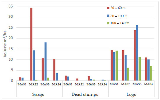The quantitative analysis of volumes in snags, dead stumps, and logs, by MAS and accessibility class, showed that in most cases the D plots had on average the lowest deadwood volume (9.9 m3/ha) (Figure 1 and Figure 2). The largest deadwood volume was found in the E plots (31.6 m3/ha), followed by the M plots (25.7 m3/ha) (Figure 2). Hence, the average volumes of snags, logs, and dead stumps decreased with decreasing accessibility (Figure 1).