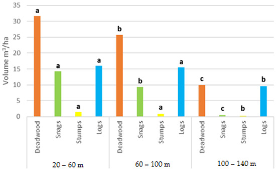 Volumes of deadwood categories for each accessibility class. Different letters indicate significant statistical differences by Tukey’s test in total deadwood and each deadwood category.