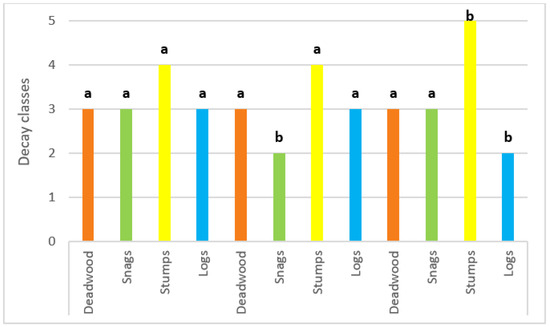 Deadwood in general had an average decay value of 3 in each accessibility class, hence no statistical differences were detected by the Tukey test (Figure 3). Snags had an average decay value of 3 in the E and D plots, and of 2 in the M plot; in fact, the Tukey test revealed this difference. Dead stumps had an average decay value of 4 in the E and M plots, statistically different from those in the D plot. Logs had an average decay value of 3 in the E and M plots and of 2 in the D plot, statistically different from those in the D plot. The Tukey test detected the statistical difference between the E and M plots, and the D plot (Figure 3). Hence, all the decay classes were present, except the first (Figure 3).