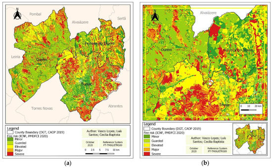 The Portuguese municipality risk map (PMDFCI) production guidelines proposed by the governmental Institute for Nature Conservation and forestry (ICNF) contemplates Hazard as a multiplication product of probability and susceptibility and potential losses as a multiplicative product of vulnerability and economic value, where risk is the multiplicative result of hazard and potential damage (Figure 1).