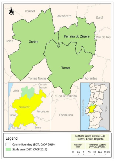 The region was once prosperous with Pinus pinaster plantations speckled with olive orchards and lowland agriculture; nowadays it is a mosaic of Eucalyptus globulus plantations, remnants of Pinus pinaster, and shrubland dominated by Ulex spp., Erica spp., Pistacea sp., Myrtus sp., and Rubus spp., where once was agriculture, confirming a trend that is further observed as we move north-eastwards. According to the data of the Official Administrative Chart of Portugal (DGT-2019), the three municipalities cover an area of approximately 95,823 ha, divided as follows: Tomar (35,120 ha), Ourém (41,666 ha), and Ferreira do Zêzere (19,037 ha).
