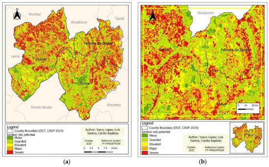 Ignition Risk Model (MIR) map considering slow variables (a) MIR for the entire region, (b) MIR detail of inter municipality boundaries.