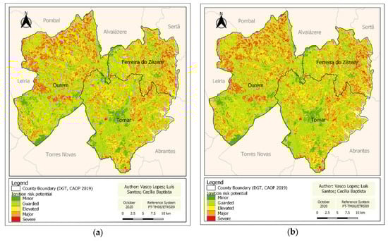 Results delivered as risk maps from the HRA for the study region were tested using the different sets of stressors to understand the differences between slow and dynamic variables. As a first run of the HRA, only slow variables were analyzed and risk classes were attributed as Minor, Guarded, Elevated, and Severe, using designated Modernized Ignition Risk (MIR) (Figure 5a). Classification considers risk is always present except for water surfaces, and therefore no risk classification was not used in the risk map.