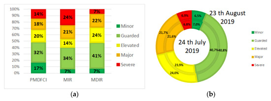 (a) Comparison bar chart between the two variations of the modernized model and PMDFCI, (b) Comparison pie chart between the MDIR of July 24 and August 23, 2019.