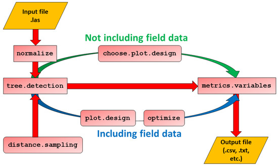 Schematic workflow of FORTLS. The pathway shown in red represents the shortest possible procedure for estimating variables and metrics. The pathway shown in green includes choose.plot.design as a previous step for assessing the stability of estimations, based only on TLS data. The pathway shown in blue includes plot.design and optimize functions with the objective of determining the best plot design according to field measured data. distance.sampling is an optional function that can be used in both approaches.