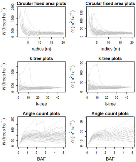 Line charts with estimated values of N and G for different plot designs (circular fixed area, k-tree and angle-count), through continuous size increments (radius, k, and Basal Area Factor (BAF), respectively). Each grey line represents a sample plot.