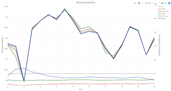 Line chart showing Pearson correlation (continuous line) and relative deviance (dotted line) for basal area estimation based on field data and the TLS derived metrics and variables: G (direct estimates of G estimated using trees detected in TLS data), G.hn, G.hr, G.hn.cov, G.hr.cov (considering occlusion corrections based on distance sampling methodologies) and G_sh (considering occlusion corrections based on the shadowing effect) through a continuous size increment (k) for the k-tree plot design.