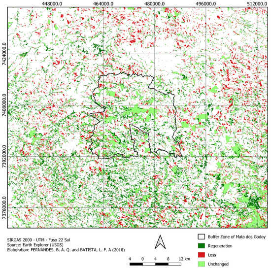 In Figure 5, it is possible to see the changes that occurred in the vegetation class between the years of 1998 and 2018. We observed that the areas where the greatest loss of vegetation is concentrated are very near urban regions, probably because the city expansion reduces the distance between rural and urban regions, modifying the landscape structure.