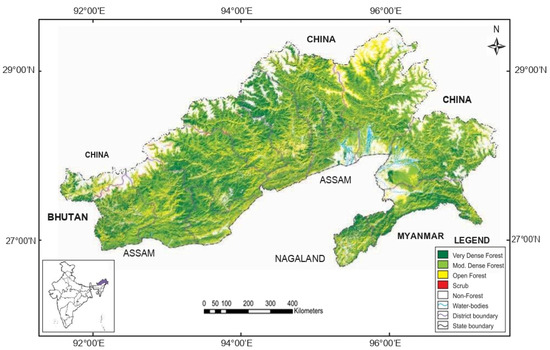 The study was carried out over the humid-subtropical forest region of Arunachal Pradesh, India, the Indian state that is enriched with the second-largest forest cover spreading over 79.63% of the total geographical area of the state [20] (Figure 1). This north-eastern state lies at the Eastern Himalayan region of the country coordinated between 26°28′ N to 29°30′ N latitude and 91°30′ E to 97°30′ E longitude and shares international boundaries with Bhutan in the west, China to the north and northeast, and Myanmar to the east. The climate varies from temperate in the northern part and warm humid in the southern part, having annual rainfall ranging between 2000 mm to 8000 mm and annual temperatures from <0 °C to 31 °C [20].