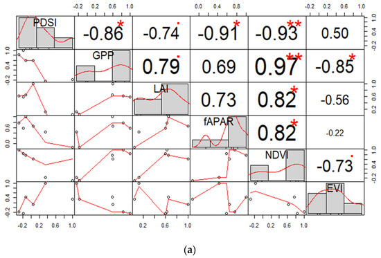 After EVI, the other vegetation parameters, i.e., LAI, NDVI, GPP, and fAPAR, respectively, were found to have high negative agreement with the PDSI.