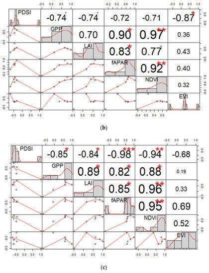 The sensitivity of the five most commonly used vegetation parameters (i.e., GPP, NDVI, EVI, LAI, and fAPAR) was tested with PDSI to understand the most sensitive parameter in reference to PDSI for the long term under tropical or humid-subtropical climatic contexts. GPP is the rate at which chemical energy (typically expressed as carbon biomass or organic substances) is created by primary producers through capturing solar energy in a given unit of area and time during photosynthesis. GPP is considered as a very useful indicator of drought conditions in terms of productivity, as reported by several studies that were mentioned before. LAI and EVI both indicate the biomass condition of vegetations. However, LAI (LAI = leaf area/ground area, m2/m2) typically characterizes plant canopies, whereas EVI is highly responsive to plant physiognomy. EVI also indicates the water balance and atmospheric droughts of leaves that are the major eco-physiological parts of a plant that interact with the atmosphere. The formula used for computing EVI is