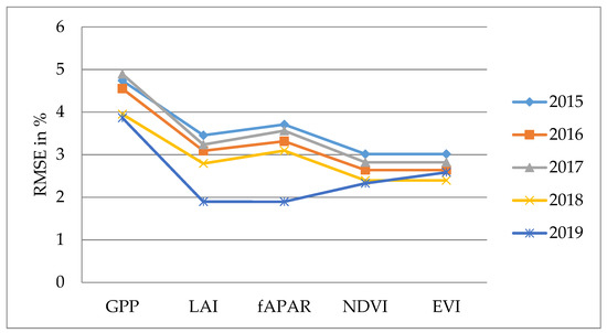 Both the EVI and NDVI showed the least uncertainties compared to the other vegetation parameters in respect to the PDSI for all five years (Figure 4). The RMSE values for both NDVI and EVI were found to range from 2.39% to 3.01% during 2015–2018, which is, overall, the lowest among the others. However, in 2019, the NDVI showed slightly lesser RMSE values than EVI, but in that year, it was fAPAR that actually showed the optimum sensitive condition to the PDSI with a RMSE of 1.89%. Overall, the estimated uncertainties (RMSE) between the PDSI and EVI and and PDSI and NDVI were found to be 1% to 2% lower compared to the others, showing better sensitivity than the other four vegetation parameters in a long-term context.
