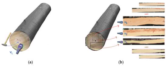 (a) Determination of the longitudinal stress wave velocity in the log(vL) by Mechanical Timber Grader (MTG); (b) Cutting of logs into sawn timber with subsequent visual assessment and determination of the longitudinal stress wave velocity in boards (vB).