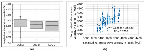 Similar to the logs, we confirmed the general trend of reducing the stress wave velocity for sawn boards by reducing the quality of the boards. The average sound velocity in boards of the class EOS-A was 3695 m/s (CV% = 6.9), in the class EOS-B 3650 m/s (CV% = 4.1) and in EOS-C 3605 m/s (CV% = 6.1). Otherwise, statistically significant differences between the quality classes of the boards were not confirmed (ANOVA, p ≥ 0.05) (Figure 3a). The measured sound velocities in the boards investigated are generally low, due to wet state testing, as previous research was mostly carried out on sawn beech structural elements made from air dried pre-sorted wood of higher quality []. However, research confirms the characteristic relationship between the dynamic mechanical properties, using longitudinal vibration, of wet and air-dried beech sawn timber [].