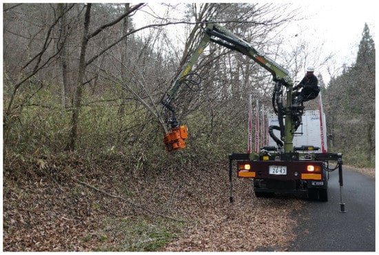 The authors’ research group has studied technologies and systems for harvesting, transporting, and chipping logging residues on steep terrain in Japan [,,,,,,]. In the case of logging residues, calculation of the procurement cost begins from the harvesting process at a logging site where the process of limbing and bucking is carried out, while the felling and accumulating processes have to be considered additionally to calculate the procurement cost of small-diameter trees. Thus, in Japan, forest biomass from small-diameter trees is considered to be a resource second to that from logging residues in the Biomass Nippon Strategy []. In this study, with the aim of discussing the effective method of harvesting such small-diameter trees as unutilized forest biomass appropriate for Japan, the harvesting of small-diameter trees was experimented with a truck-mounted multi-tree felling head and time-studied.