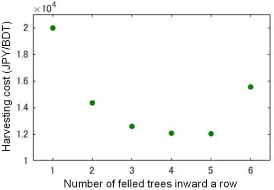 The maximum reach of the felling head used in the experiment was 6.7 m so that the machine could fell, in the model forest, the maximum six trees inward a row from a forest road with 3 m of road width taken into consideration. Figure 2 shows the relationship between the number of felled trees inward a row and the harvesting cost, and the harvesting cost was the cheapest when the machine felled five trees inward a row. The following reasons were considered to lie behind this result: The more trees inward a row the machine felled, the more trees were harvested at one operation point. In this case, however, the machine’s total moving time markedly increased because the frequency of moving among operation points increased. Therefore, it was concluded that there was the optimum number of felled trees inward a row that could minimize the harvesting cost.