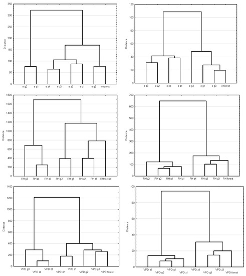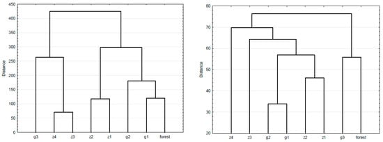 During the spring and summer period, the thermal measurements at the measuring station located in the NE part of the gap (g3) were similar to those located in the centre (z3) and in the NE part of the clear-cut (z4). A separate group was that of the points lying on the clear-cut near the forest wall (z1) and 15 m from it (z2), while the stations located in the SW and in the central part of the gap (g1, g2) were similar in terms of temperature at the point located in the forest (Figure 1). In autumn, the thermal differentiation on the examined surfaces was smaller (Figure 1)