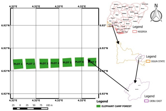 The study was conducted in the elephant forest reserve in the Omo Forest Reserve. The Omo Forest Reserve is located between latitude 06°51′00″ N and 06°91′00″ N and longitude 04°22′48″ E and 04°32′48″ E at an altitude of 150 m above sea level (asl) in the Ijebu area of Ogun State in Southwest Nigeria [8]. It is one of the remaining protected forests in Southwest Nigeria. The Elephant Camp national forest covers approximately 55,000 ha (Figure 1).