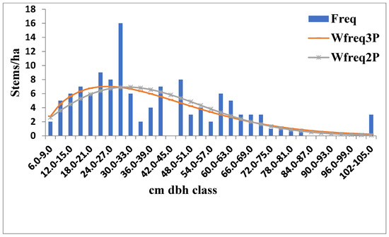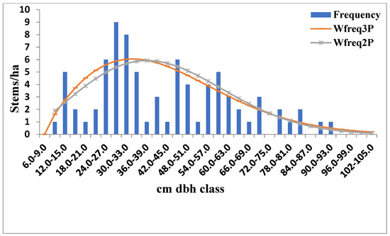 The stem diameter of trees in Riparian and Old-growth forests was categorised into size classes of 3 cm dbh width, starting from the smallest to the largest. A histogram of the dbh classes was produced, and single two- and three-parameter Weibull distributions [12] were used for fitting size–density distributions of Riparian and Old-growth forests. The two- and three-parameter Weibull functions are expressed as Equations (4) and (5), respectively: