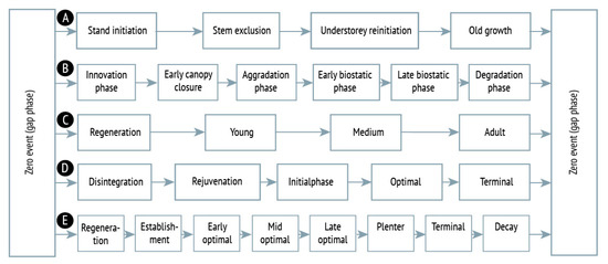 Different sequences of forest development phases depending on the classification approaches of: (A) Oliver and Larson [7]; (B) Oldeman [6]; (C) Duncker [2]; (D) Leibundgut [5]; (E) Tabaku et al. [9]. Not all the phases refer to the same hierarchical level.