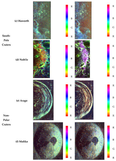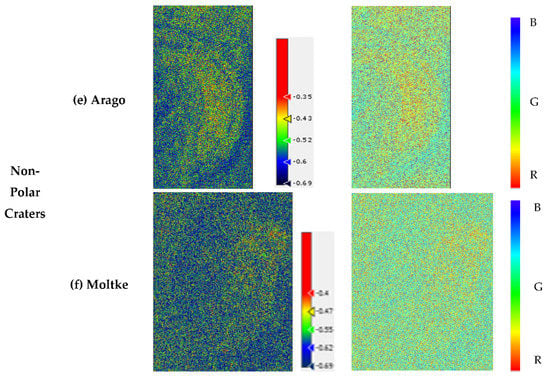 The m-δ and m-χ polarimetric decomposition for Gioja, Crater1, Haworth, Nobile, Arago, and Moltke craters and their surrounding region outside the craters are shown in sections (a–f). Here, the craters describe different scattering mechanisms where R (red color), G (green color), and B (Blue color) represent double-bounce, volumetric, and surface scattering, respectively.