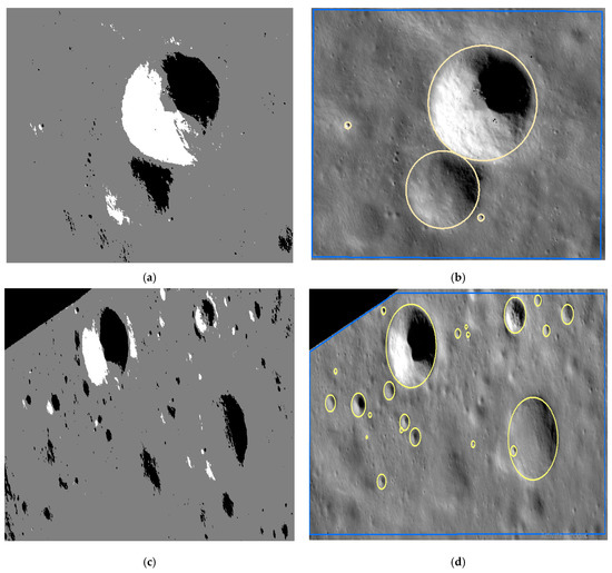 Detected crater boundaries using (a,c) Histogram-based extraction, and (b,d) ArcGIS Crater Tool for two regions subsetted from the study area.