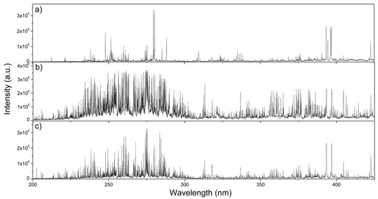 The major chemical elements in diesel particulate matter were obtained by the laser-induced breakdown spectroscopy set-up shown in the previous section. Examples of measured LIBS spectra from different diesel particulate matter samples are shown in Figure 2. In this figure, the x axis represents the measured spectral wavelength and the y axis represents the intensity of the measured spectral LIBS signal in arbitrary units (a.u.). Arbitrary units are used due to the lack of an absolute intensity signal. Therefore, this is the reason why in practice, the LIBS signal has to be further calibrated. Measured laser-induced breakdown optical spectra obtained from DPM exhibit typical line spikes with distinct line peaks, generated from atomic, ionic and molecular spectral transitions corresponding to different chemical elements. In the Figure 2 spectrographs, we can observe strong optical line emissions mainly from major chemical elements: in spectrum (a), Ca, Mg and Zn; in spectrum (b), Ca, Cr, Fe, H, Mg and Na; and in spectrum (c), Al, C, Ca, Cr, Mg and O.