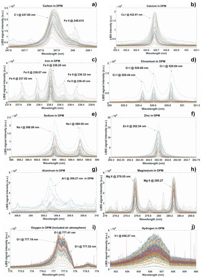 In Figure 3 are shown high-resolution LIBS spectral data from 67 samples of diesel particulate matter extracted from in-use diesel engine passenger vehicles. Spectra are from the most abundant lines from major chemical elements: carbon (a), calcium (b), iron (c), chromium (d), sodium (e), zinc (f), aluminium (g), magnesium (h), oxygen (i) and hydrogen (j) spectral lines. The measured chemical elements were characterised as major components of diesel particulate matter in our previous publications. More details related to this study are explained in [15,20].