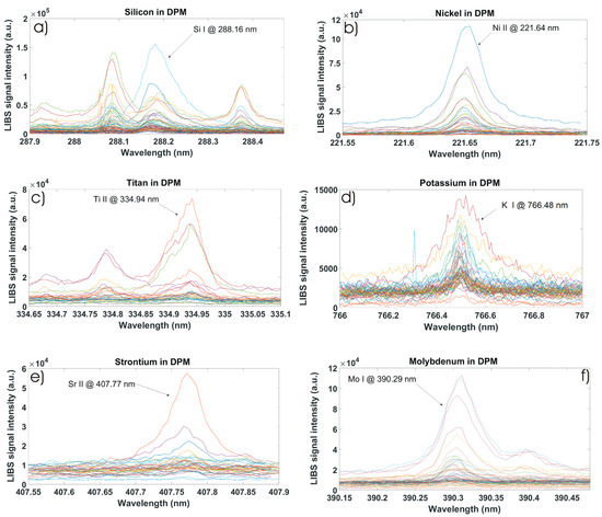 Optical emission from minor chemical elements measured by LIBS from different diesel particulate matter samples. Spectra from (a) silicon, (b) nickel, (c) titan, (d) potassium, (e) strontium and (f) molybdenum.