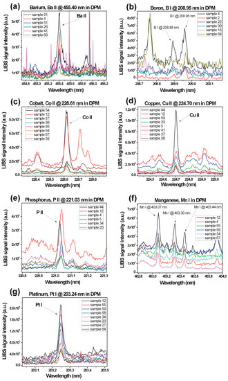 Optical emission spectra from trace elements: (a) barium, (b) boron, (c) cobalt, (d) copper, (e) phosphorus, (f) manganese and (g) platinum. These were measured by the high-resolution LIBS technique from diesel particulate matter samples collected from in-use diesel engine passenger vehicles.