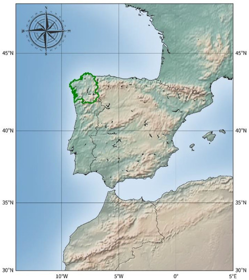 Regional borders of Galicia highlighted in green.