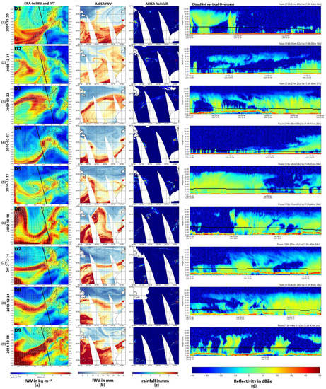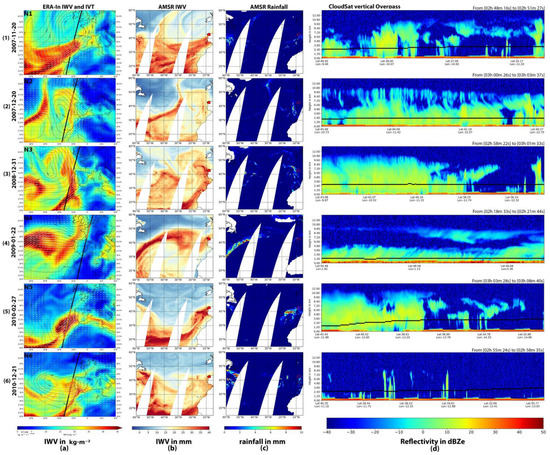 Figure 2 (day-time) and Figure 3 (night-time) show the 15 AR events analyzed with the methodology described in the previous section. Columns (a) show the ERA-In IWV and Integrated Water Vapor Transport (IVT) fields together with the overpass of the satellite. Columns (b) show the same IWV fields observed using the AMSR sensor, which also retrieves the precipitation rate stated in columns (c). Note that even though every AR event analyzed in this article led to anomalous precipitation, these values of precipitation rate are not the alleged anomalous or extreme accumulated rainfall. These values correspond to the rate of precipitation at the precise moment of the overpass. On the one hand, the coincidence between the overpass and the AR may occur even 24 h before or after the AR makes landfall. On the other hand, anomalous precipitation events over Galicia usually require large periods of intense precipitation (equal to or longer than 24 h) to occur. Values shown in columns c) just provide a snapshot of the precise moment when CloudSat approaches, and not the complete accumulated precipitation that has been labeled as anomalous. Finally, columns d) show the vertical overpass reflectivity in dBZe, together with the specific time of the data acquisition. The freezing level is also displayed in black lines for the last column. All the reflectivities provided by the CloudSat, which is located above the freezing level, are considered cold rain. The reflectivity measured below that level is considered as warm rain.