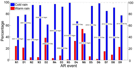 Fraction of cold rain (blue) and warm rain (red) measured for each AR event.