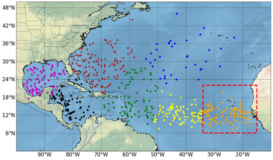 Colored dots represent the tropical cyclone (TC) geneses clustered according to the K-means method. The region bounded by the red dashed lines (6° N–22° N of latitude and 15° W–34° W of longitude) corresponds to the target region. Period 1980–2018.