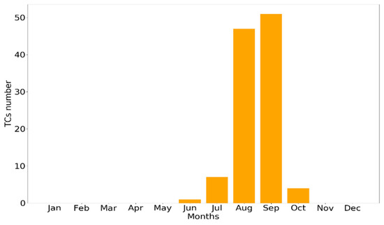 Number of TCs per month formed within the region delimited by the red box shown in Figure 1 during the period 1980–2018.
