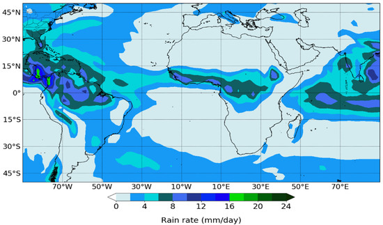 The climatological precipitation for the hurricane season for the period 1981–2010 is shown in Figure 3. It shows a rainfall pattern characterized with values ranging from 2 to 4 mm/day over the region of study and between 10 and 12 mm/day over the southern WA. This pattern is attributed to the influence of the Intertropical Convergence Zone (ITCZ) and therefore the moisture transport from the north and south hemispheres. As Gray and Landsea [39] showed, the African rainfall before August 1 has a significant correlation with subsequent intense hurricane activity. Therefore, the cyclone activity in the eastern tropical Atlantic Ocean has been related to the intensity of the WAM and the positional shifts in the African easterly jet (AEJ) and African easterly waves [40].