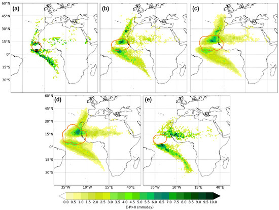 The climatological pattern of (E − P) > 0 obtained in a backward experiment from the outer radio of TCs formed in the study region during (a) June, (b) July, (c) August, (d) September, (e) and October. The orange line delimits the relative frequency of the outer radius of each TC. Note that no TC geneses occurred in November. Period 1980–2018.