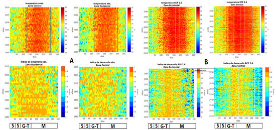 Figure 1 and Figure 2 show the thermal behavior of RCP 2.6, 4.5, and 8.5 in comparison with the baseline scenario. They show that Tm increases from low to high scenarios. There was a tendency to decrease the temporal space of the crop from November to April, particularly under RCP 4.5 and 8.5 scenarios, and with greater accentuation in the central zone of the country. The ITDB decreased considerably, which showed the probable insufficient viability for the maturation phase.