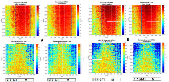 The bioclimatic scenario under RCP 4.5 (A) and RCP 8.5 (B). The behavior of the mean temperature (upper level) and the Thermal Index of Biological Development of Solanum tuberosum (L.) according to the phenological phases: sowing (S), sprouting (S), growth and tuberization (G-T) and Maturation (M) in Various Crops Enterprise “Güira de Melena”, Artemisa—western region (lower left level), and Various Crops Enterprise “La Cuba”, Ciego de Ávila—central region (lower right level). Period 2010 to 2100.