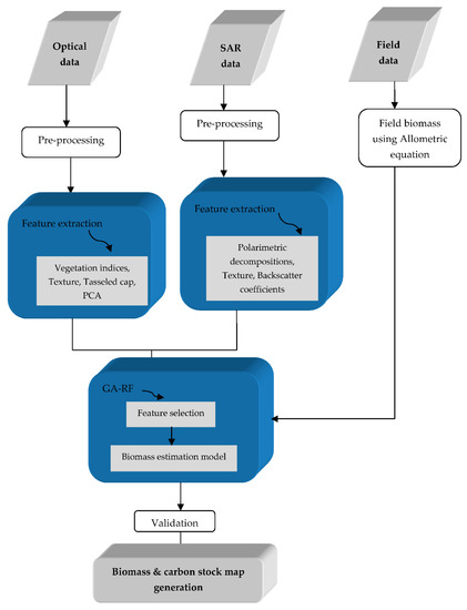 In this study, forest above ground biomass and carbon stock modelling has been performed by GA-RF method. Figure 2 shows the process of AGB and carbon stock estimation which consists of the following: