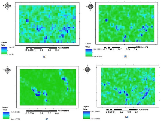 The best selected features of the Optical data for biomass estimation by GA: (a) texture (Data range variable) of band 6, (b) texture (variance variable) of band 6, (c) texture (variance variable) of band 5, (d) texture (variance variable) of band 8.