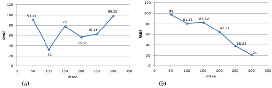 The RMSE variation based on ntree: (a) modelling by optical data, (b) modelling by SAR data.