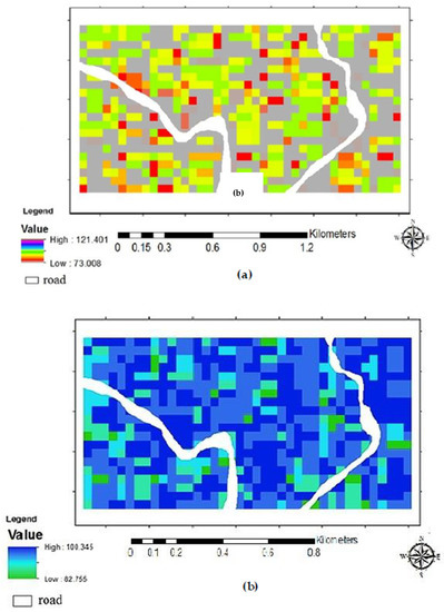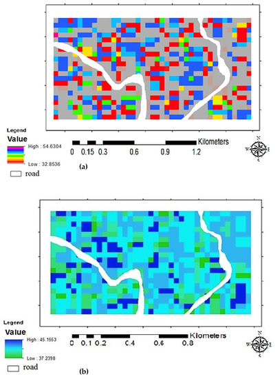 Above ground biomass derived from GA-RF: (a) AGB by optical data, (b) AGB by SAR data.