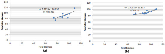 Comparisons between the field AGB and predicted AGB derived from Optical and SAR data: (a) modelling by Optical data, (b) modelling by SAR data.