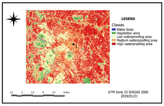 When identifying the regions of temperatures between 31 and 34 °C (Figure 9), in the soil cover map (Figure 7) it appears that these were classified as areas of average waterproofing and presented values between 0.349 and 0.458 in the index NDBI (Figure 8).