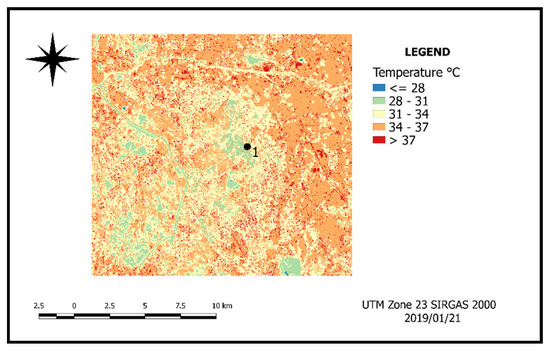 According to INMET, the municipality of São Paulo had an average temperature of 23 °C on 21 January 2019 [11]. When analyzing the ST map generated in the QGIS software for the image of 21 January 2019, temperature values between 28 and 37 °C were identified in the study area (Figure 9). Note the predominance of areas of temperatures between 34 and 37 °C. When looking for these same areas in the soil cover map (Figure 7) and in the NDBI index (Figure 8), it is observed that the areas were classified as high waterproofing, which has little or no afforestation and presented an urbanization index (NDBI) ranging from 0.349 to 0.458. This high temperature is a result of the materials used in construction, which are characterized by high heat retention. Due to the removal of vegetation from the region and the substitution by materials that waterproof the soil, such as concrete, glass, asphalt, metal, there is a specific increase in temperature in the area [7].